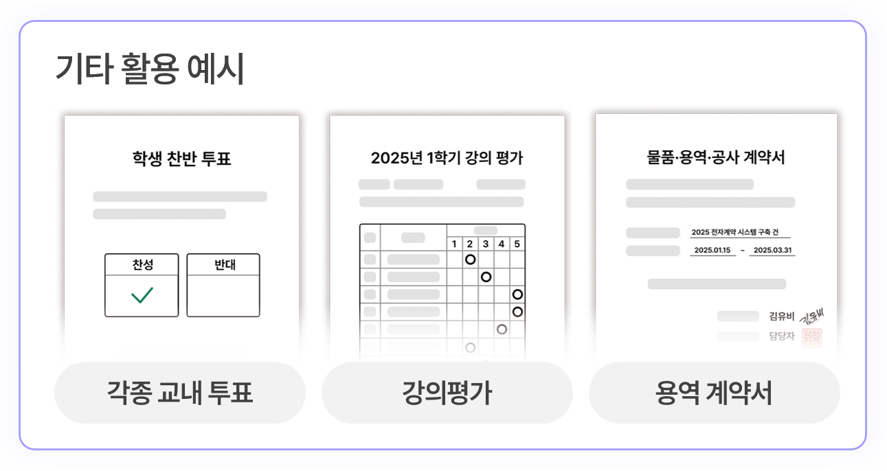 - 교내 학생회 선거, 교수회 의사결정 등 각종 투표, 강의평가, 용역 계약서, 학술정보 열람 신청서, 학생생활관 입주 계약서, 성적 이의신청서 등