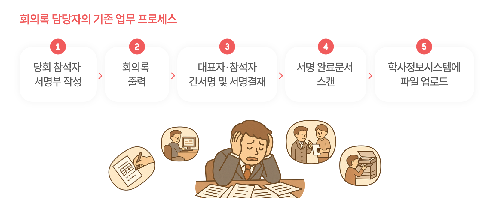 회의록 담당자의 업무 대부분이 참석자 서명부 작성, 회의록 출력, 대표자 및 참석자 간서명/서명 결재 요청, 문서 스캔 및 학사정보시스템 업로드 등 수기 처리에 집중되어 있었습니다. 이는 업무 효율성을 크게 저해하는 요인이었습니다. - - 고유 양식과 일반 솔루션의 한계: