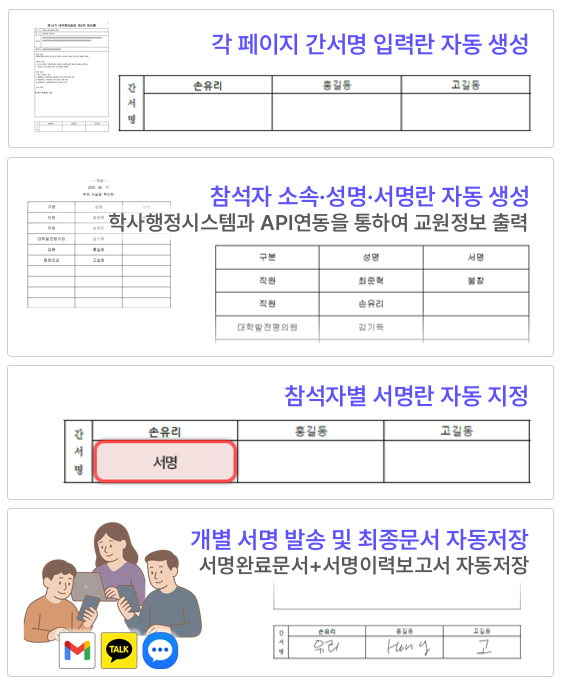 학사행정시스템에서 참석자 정보를 자동으로 불러와 서명란에 매핑하고, 모든 서명 요청 및 처리가 비대면으로 진행됩니다.