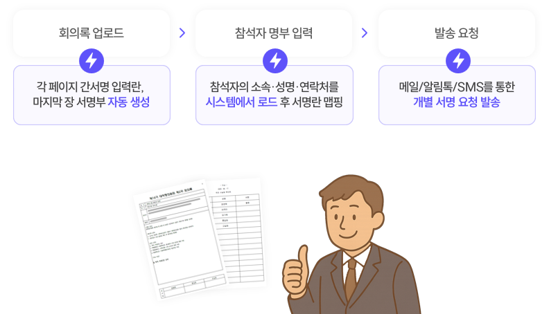 이는 특히 담당자가 수동으로 수행해야 했던 참석자 명부 작성, 서명 요청을 위한 대면 소통, 문서 스캔 및 시스템 업로드 등의 물리적/반복적 수작업 단계가 거의 사라지고 시스템이 이를 자동으로 처리하면서 달성된 결과입니다. - 2)고유 양식에 최적화된 서명 프로세스